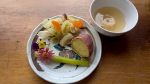 焼き芋 アスパラ キャベツとしめじの和え物 味噌汁