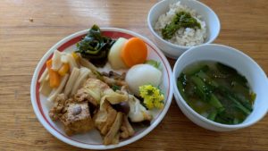分付き米 めかぶとろろ 温野菜(かぶ、人参、じゃがいも) 厚揚げとお野菜のホイコーロー 割干し大根煮 わかめのしゃぶしゃぶ 味噌汁