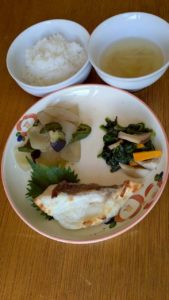 ごはん ほうれん草のお浸し 鯛のムニエル 茄子と玉ねぎの味噌炒め 味噌汁