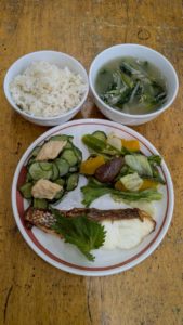 分付き米 夏野菜塩麹サラダ 鯛のムニエル きゅうりと角麩の梅味噌和え 味噌汁