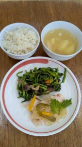 ごはん 小松菜のお浸し 鶏肉とじゃがいもの煮物 ズッキーニ焼き 味噌汁