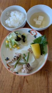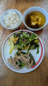ごはん 海藻サラダ 豚肉といんげんの炒め物 じゃがいも煮 すまし汁
