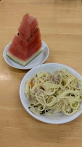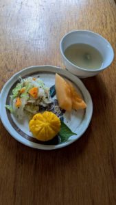 かぼちゃ茶巾 メロン キャベツのゆかり和え 味噌汁