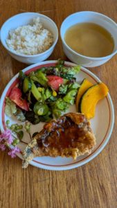ごはん かぼちゃサラダ 鯛のムニエル トマト 味噌汁