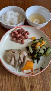 ごはん チンゲン菜の磯辺和え 手羽元とごぼうの醤油麹煮 塩金時豆煮 味噌汁