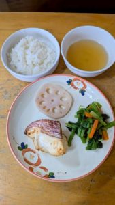 ごはん 小松菜の梅和え 鯛の照り焼き れんこん煮 そうめん汁