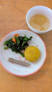 かぼちゃもち ごぼう煮 ほうれん草のおかか和え 白菜の味噌汁