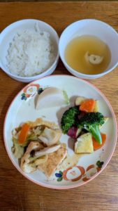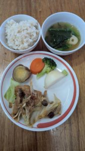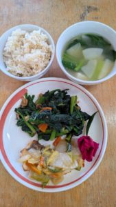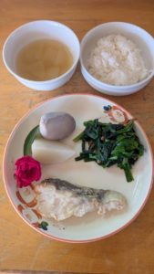 ごはん ほうれん草のなめこ和え たらのムニエル 里芋とかぶの煮物 玉ねぎの味噌汁