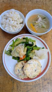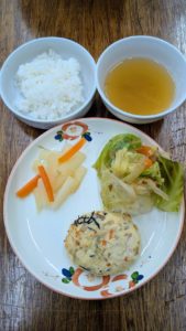 ごはん キャベツのおかか和え おから入り豆腐ハンバーグ 大根のきんぴら もやしの味噌汁
