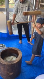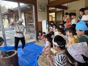 今日はお餅つき。年長さんがぺったんぺったんついたおもちをみんなでいただきました。