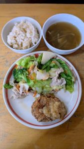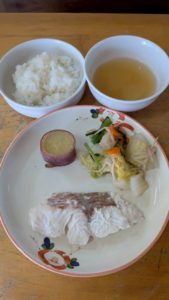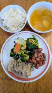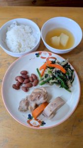 分付き米 白菜とほうれん草のおかか和え ゆで鶏のれんこんだれ 金時豆煮 じゃがいもと玉ねぎの味噌汁
