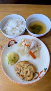ごはん ほうれん草と切干大根のえごま和え 鶏肉とれんこんの煮物 塩金時豆煮 じゃがいもの味噌汁