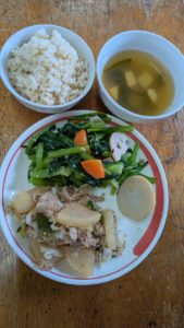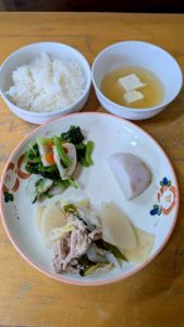 ごはん 小松菜とれんこんのゆかり和え 豚肉と大根の甘辛炒め(醤油麹) 里芋のゆず煮 豆腐の味噌汁