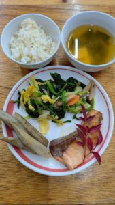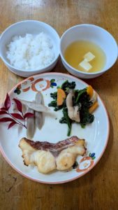 ごはん ほうれん草としめじのお浸し 鯛の幽庵焼き ごぼうの麦味噌煮 豆腐の味噌汁