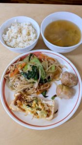 分付き米 チャプチェ 厚揚げのねぎ味噌チーズ焼き 里芋の煮っころがし キャベツのわかめの味噌汁