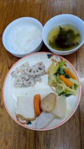 ごはん 野菜炒め 厚揚げと根菜の煮物 れんこんのゆかり和え わかめの味噌汁