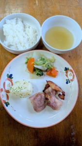 ふかしいも れんこん煮 白菜のおかか和え わかめの味噌汁