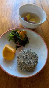 胡麻おはぎ 柿 ほうれん草のえのき和え さつまいもの味噌汁