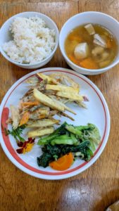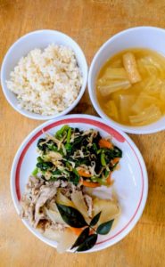 ごはん チンゲン菜のゆかり和え 鶏肉と玉ねぎの生姜炒め 里芋煮 ごぼうの味噌汁