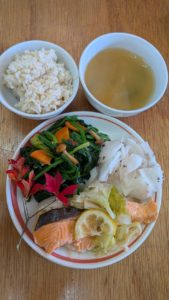 分付き米 ほうれん草のなめこ和え 鮭とキャベツのレモン蒸し 大根の梅酢漬け もやしとわかめの味噌汁