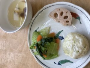 じゃがもち れんこん煮 チンゲン菜のナムル しめじの味噌汁