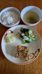 分付き米 小松菜とれんこんのゆかり和え 鶏肉の塩酒かす焼き 刻み昆布とさつまいも煮 もやしと焼きねぎの味噌汁
