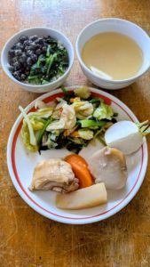 大根もち ごぼう煮 チンゲン菜の和え物 味噌汁