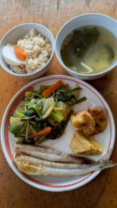 分付き米 ほうれん草とキャベツのお浸し 秋刀魚の塩焼き 茄子とピーマンのしぎ焼き じゃがいもとわかめの味噌汁