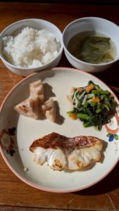 分付き米 白菜と春菊のナムル 松風焼き 柿とかぶのサラダ じゃがいもとわかめの味噌汁