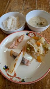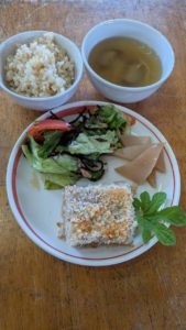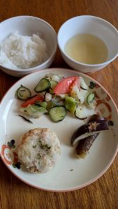分付き米 塩麹野菜炒め 長芋の肉巻き れんこんの土佐煮 薄揚げ入り呉汁
