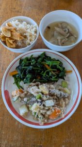 分付き米 ほうれん草と豆もやしのナムル 高野豆腐と冬瓜の炊き合わせ 豚汁