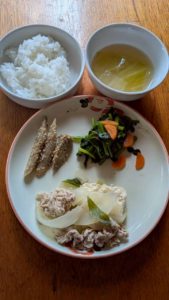 ごはん うち豆入り小松菜の煮浸し つくね煮 れんこんの土佐煮 玉ねぎの味噌汁