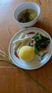 さつまいもあんのおはぎ カリカリ棒 ほうれん草の磯辺和え 味噌汁