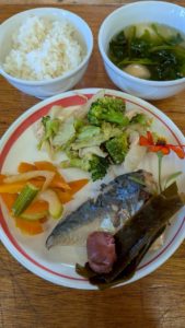 分付き米 キャベツとブロッコリーのごまサラダ 鯖の梅干し煮 セロリと人参のきんぴら ほうれん草とふの味噌汁