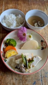 分付き米 ほうれん草のえごま和え ほっけの塩焼き れんこん入りひじき煮 酒粕入りさつまいもと玉ねぎの味噌汁