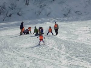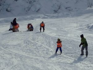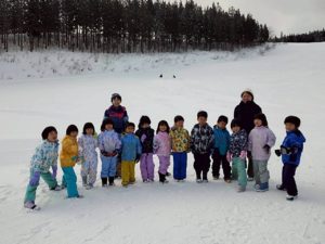 1月27日に保育園に泊まり、28日の朝、大きな観光バスに元気に乗り込み、和泉スキー場にむかいました。1日目はギュッと踏ん張ってとまれるように何度も繰り返し、その後、スキー板を持って登っては滑るを繰り返しました。2日目は、待ちに待ったリフトに乗りゲレンデへ。長いゲレンデを一人一人滑りおりてきました。転んでも起き上がる姿は、逞しかったです。