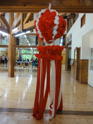 3,4,5才児で6つのグループに分かれて輪つなぎを作りました。その時のグループで給食を食べました。